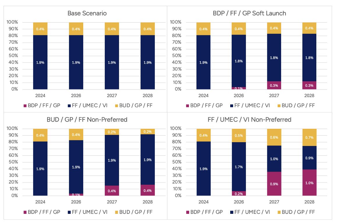 - Base Scenario: market share baseline assuming current triple-therapy product availability (i.e., in the absence of BDP/FF/GP)