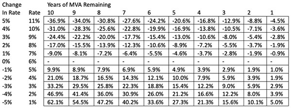 Example for seven years remaining and 300bps decrease: MVA Credit% = (1.06 / (1.06 - 0.03)) ^ 7 – 1 = 22.3% Total Obligation = Accumulation Value * ( 1 + 22.3% - Surrender Charge%) If nothing changes after a year, the MVA Credit% decreases from 22.3% to 18.8%.