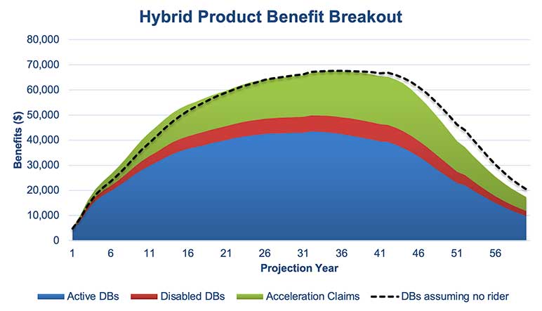 Figure 2 below shows death benefits (DBs) and LTC acceleration benefits from our illustrative IFP hybrid model consisting of a distribution of approximately 350 policies with issue ages varying from 25 to 75, and approximately US$1.2M of annualized premium.
