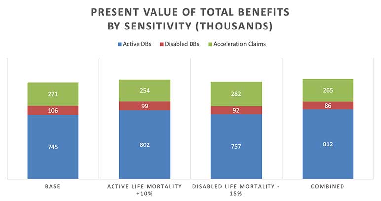 Figure 3 below shows results from our illustrative IFP model under four different scenarios: A base run, a 10 percent increase in mortality for active lives only, a 15 percent decrease in mortality for disabled life mortality, and both sensitivities combined.