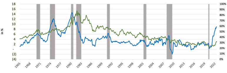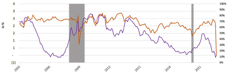 Larry Summers, the senior U.S. Treasury Department official throughout President Clinton's administration, has urged caution[2] and has pointed out that market inflation expectation measures have increased more than during any comparable period in this century, except for moments when inflation expectations were in the basement, as in 2008 or the early days of this pandemic. However, the treasury curve as measured by the difference between the 10-year yields and the 2-year yields has steepened starting late 2020, only to flatten further by mid-2022 (Chart 2). The five year and five year forward inflation expectations have similarly steepened in 2021 only to flatten thereafter. In current months, such fast moving indicators have steered the debate into the nature of inflation being transitory or persistent[3].